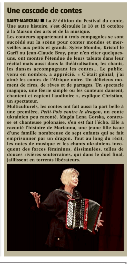 Magda Lena Gorska, conteuse polonaise d’expression française qui sillonne depuis bien des années la culture ukrainienne, nous livre avec ardeur ce duel inégal et surprenant. Tout au long du récit, la légèreté subversive de l’humour ukrainien nous transporte. Le conte est parfumé de notes d’accordéon et de chants de plusieurs régions d’Ukraine. Ils invoquent des forces féminines dissimulées telles une douce rivière souterraine qui, dans le duel final, jaillit en torrent libérateur.